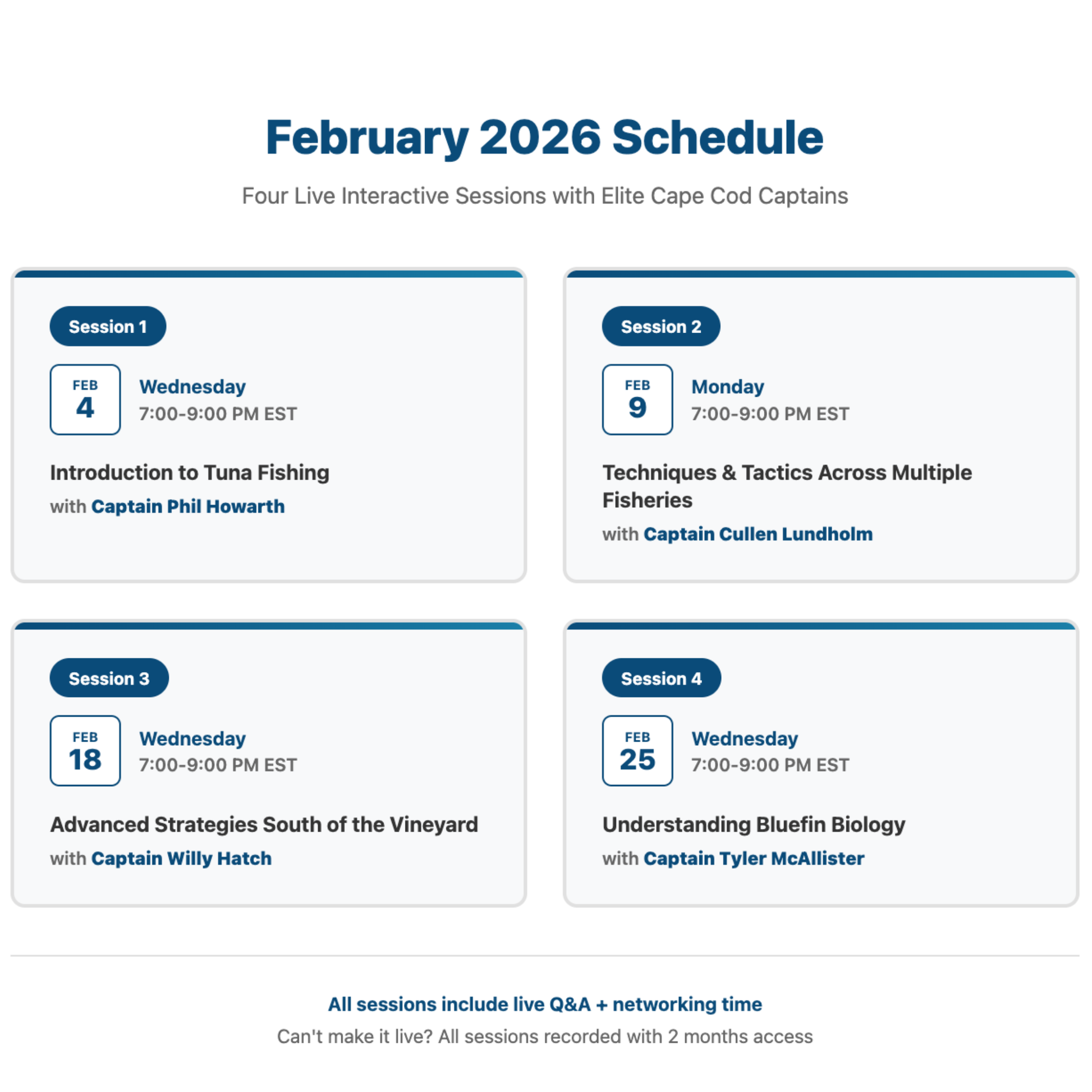 Learn from four of Cape Cod's most respected bluefin tuna captains in live, interactive sessions this February. This isn't a pre-recorded webinar series—you'll ask questions, get real-time advice, and connect with serious anglers during the off-season when you actually have time to learn.
